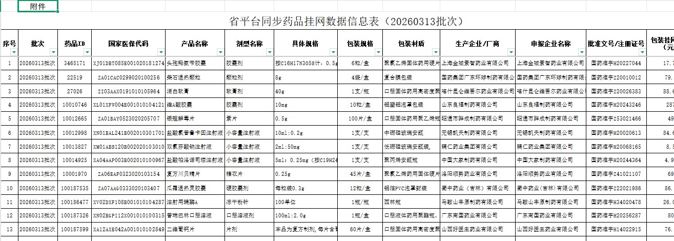广东省平台同步药品挂网数据信息表(20260313批次)