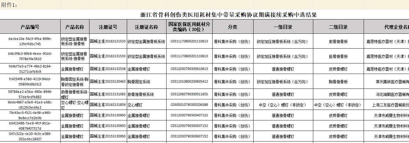 浙江省骨科创伤类医用耗材集中带量采购协议期满接续采购中选结果(20260320)