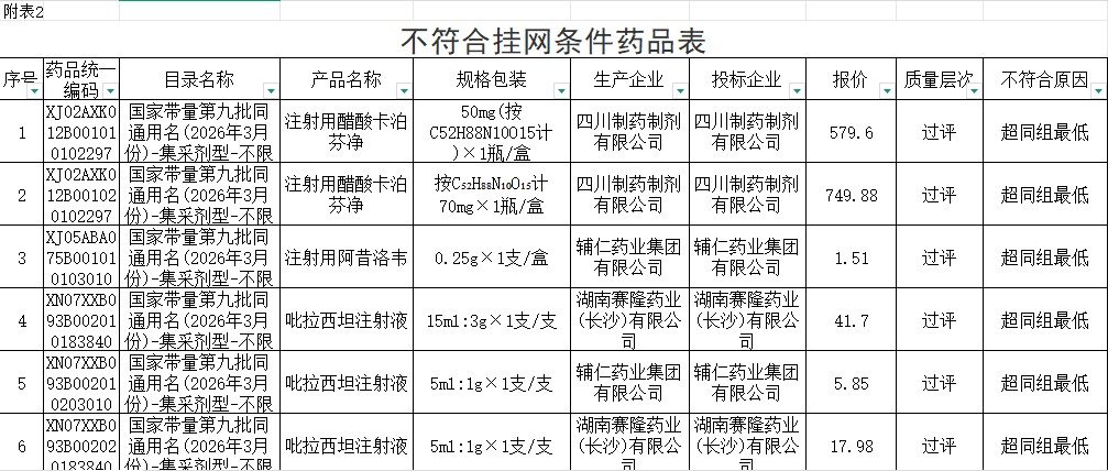 河北省部分集采同通用名药品不符合挂网条件药品表(20260326)