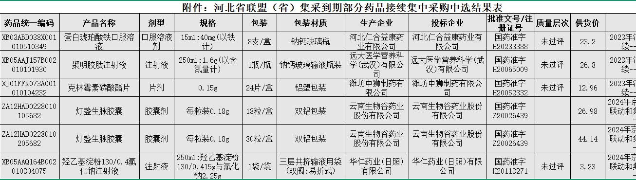 河北省联盟(省)集采到期部分药品接续集中采购(HBYPJC-2026-01)中选结果表