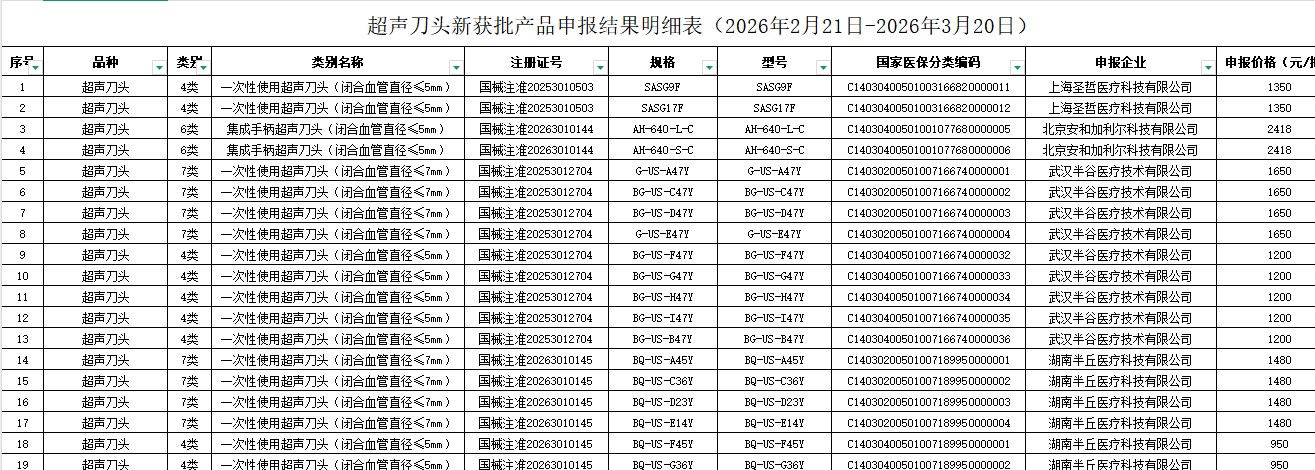深圳市超声刀头新获批产品申报结果明细表2026年3月