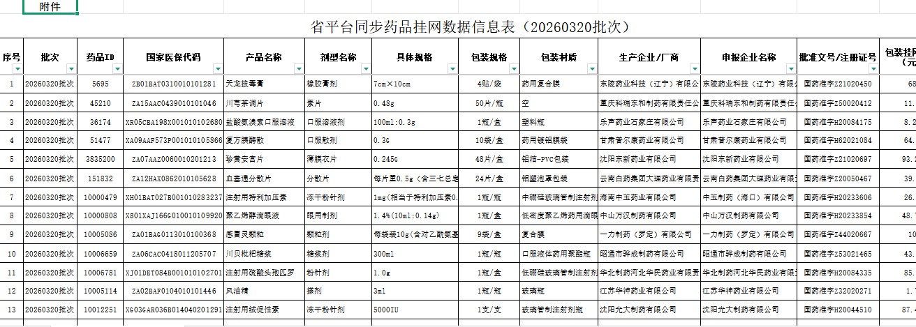 广东省平台同步药品挂网数据信息表(20260320批次)