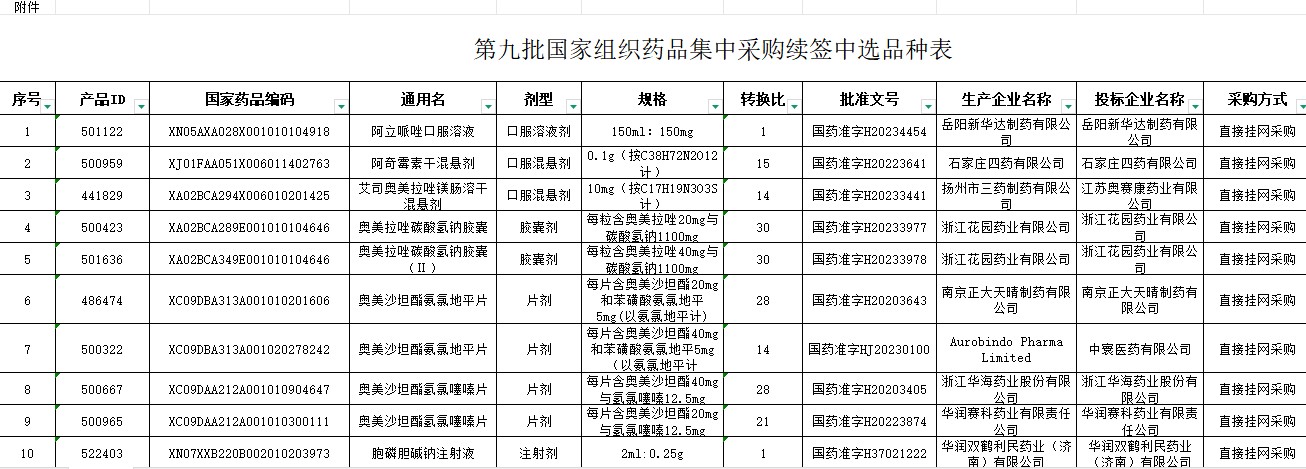 广东省2026年第九批国家组织药品集中采购续签中选品种表