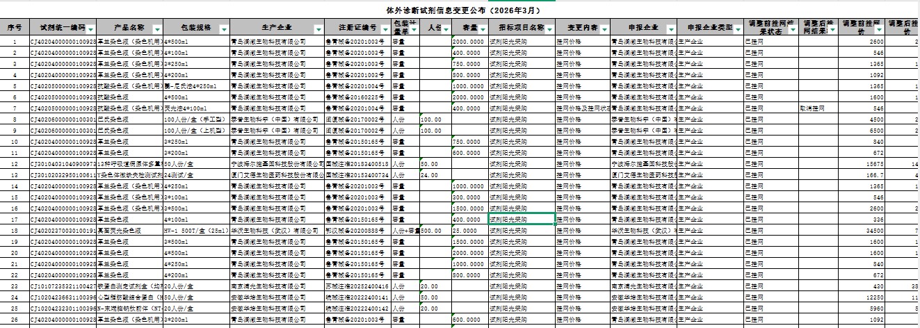 广西壮族自治区2026年3月体外诊断试剂申请变更产品资质、挂网价格、挂网状态等信息产品表