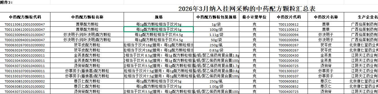 广西壮族自治区2026年3月纳入挂网采购的中药配方颗粒汇总表