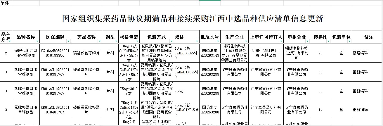 国家组织集采药品协议期满品种接续采购江西中选品种供应清单信息更新