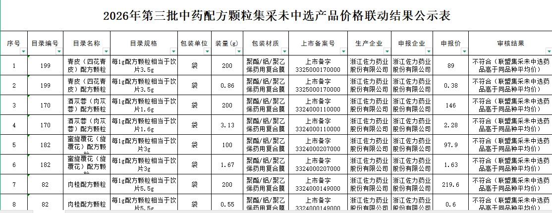 甘肃省2026年第三批中药配方颗粒集采未中选产品价格联动公示表