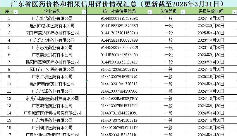 广东省医药价格和招采信用评价情况汇总(更新截至2026年3月31日)