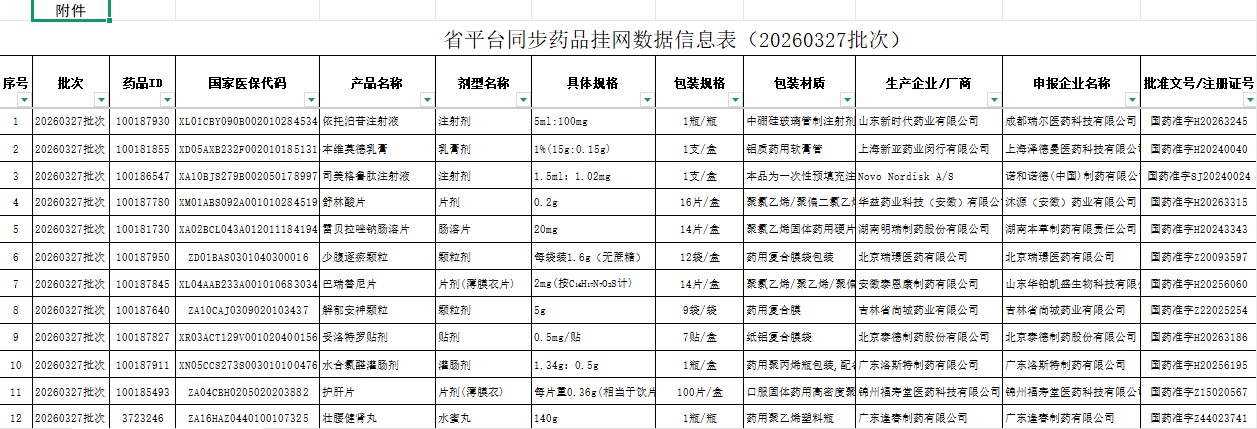 广东省平台同步药品挂网数据信息表(20260327批次)