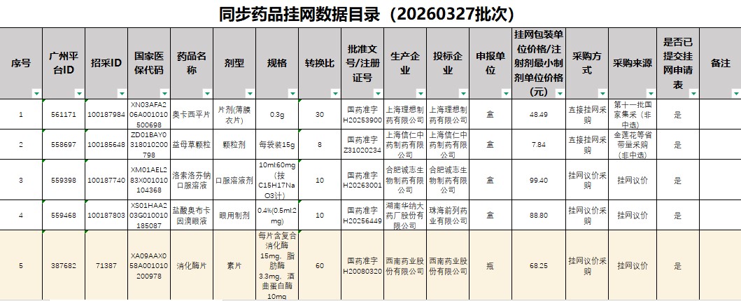 广州市同步药品挂网数据目录(20260327批次)