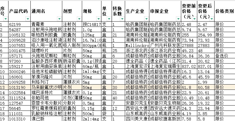 河南省注射用头孢唑肟钠等98个调整药品价格信息表