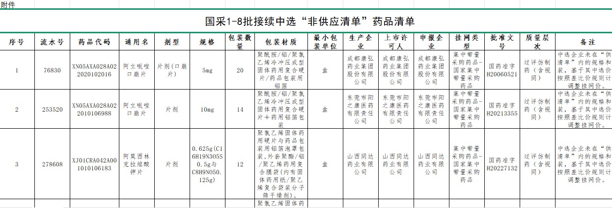 湖北省国采1-8批接续中选“非供应清单”药品清单