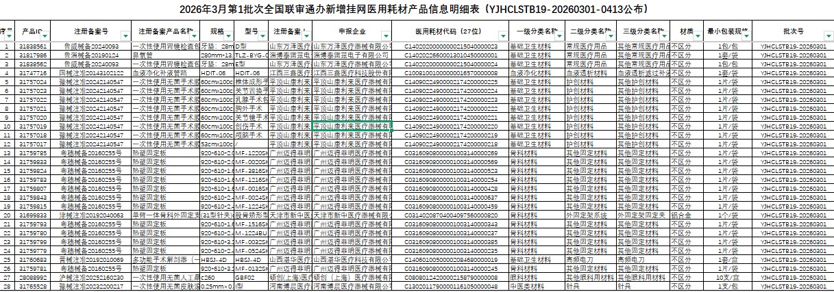 广东省2026年3月第1批次全国联审通办新增挂网医用耗材产品信息明细表(YJHCLSTB19-20260301-0413公布)