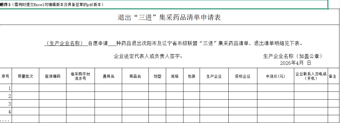 辽宁省沈阳市退出“三进”集采药品清单申请表