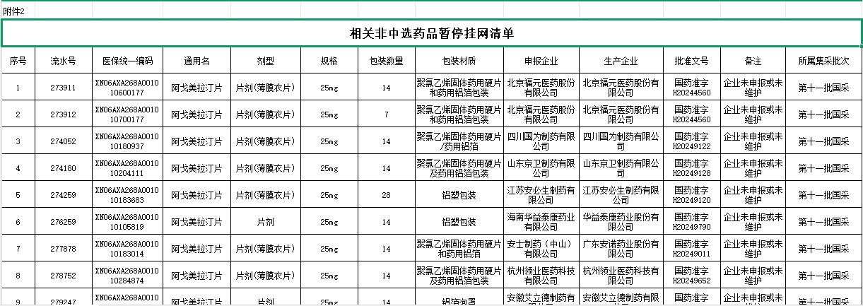 湖北省第十一批国采相关非中选药品暂停挂网清单