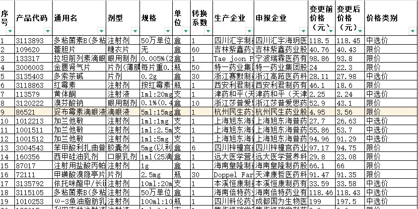 河南省拉坦前列素滴眼液等80个调整药品价格信息表