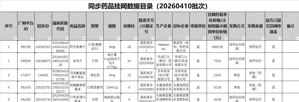 广东省广州市同步药品挂网数据目录(20260410批次)