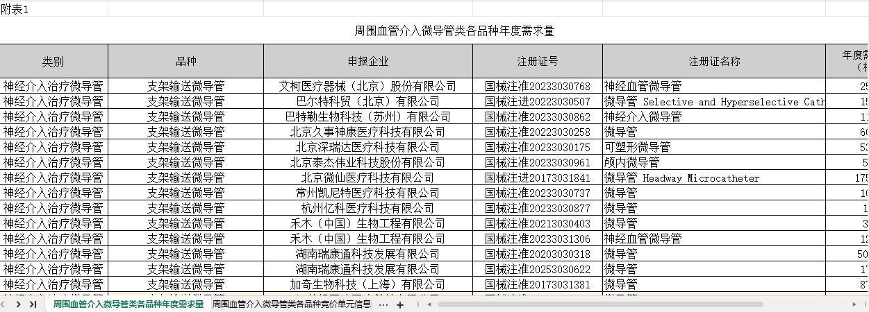 浙江省周围血管介入微导管类各品种年度需求量及竞价单元信息