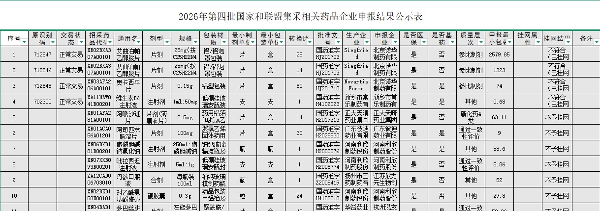 甘肃省2026年第四批国家和联盟集采相关药品企业申报结果公示表