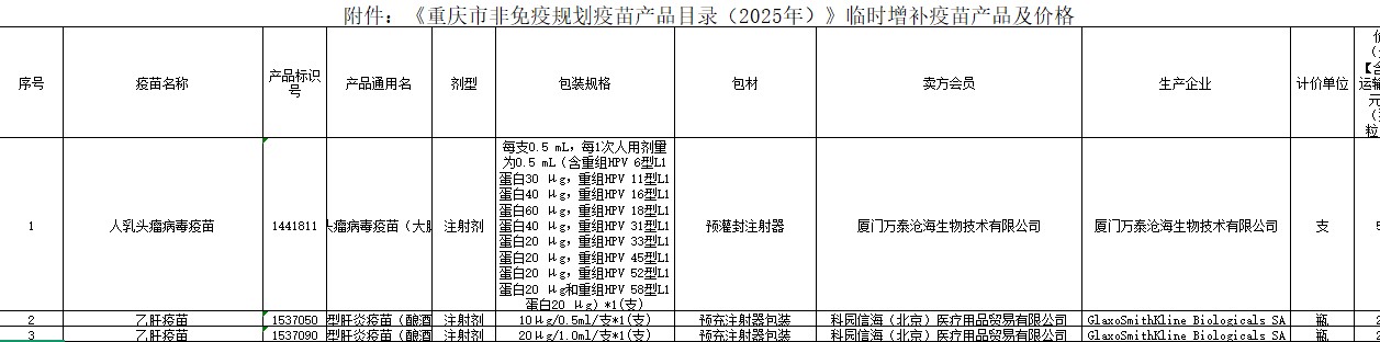 《重庆市非免疫规划疫苗产品目录(2025年)》临时增补疫苗产品及价格