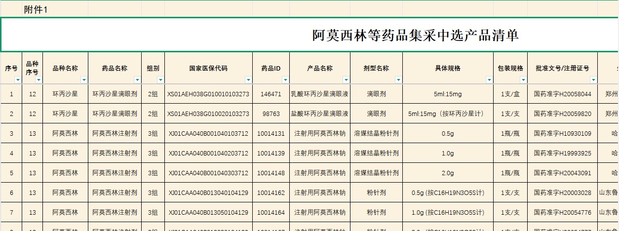 广东省阿莫西林等药品集采中选产品清单