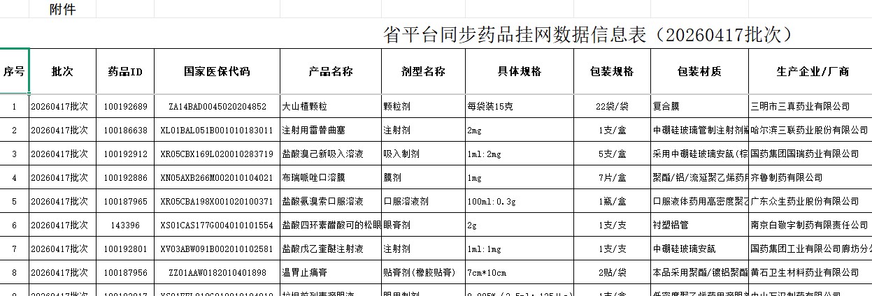 广东省平台同步药品挂网数据信息表(20260417批次)