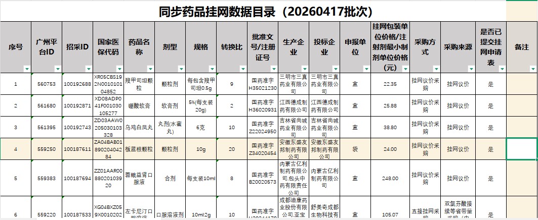广东省广州市同步药品挂网数据目录(20260417批次)