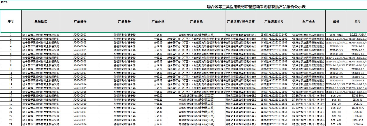 重庆市吻合器等三类医用耗材带量联动采购新获批产品报价公示表