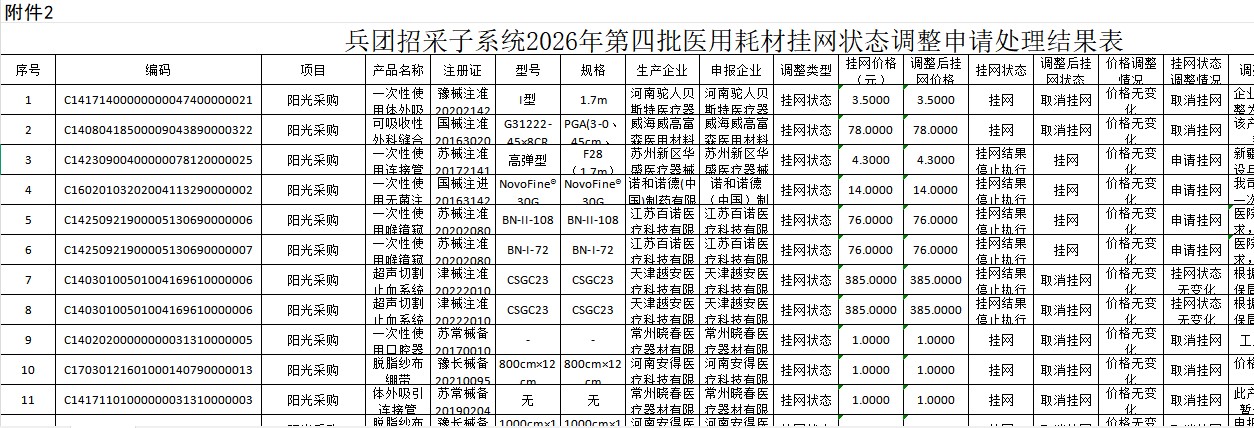 新疆生产建设兵团招采子系统2026年第四批医用耗材挂网状态调整申请处理结果