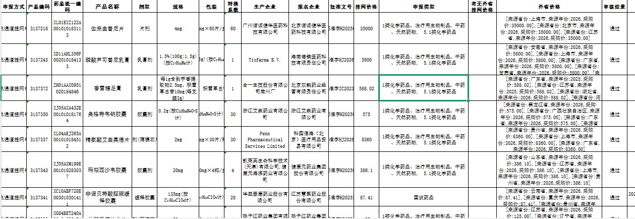 河南省2026年4月20日-2026年4月26日绿色通道申报药品清单