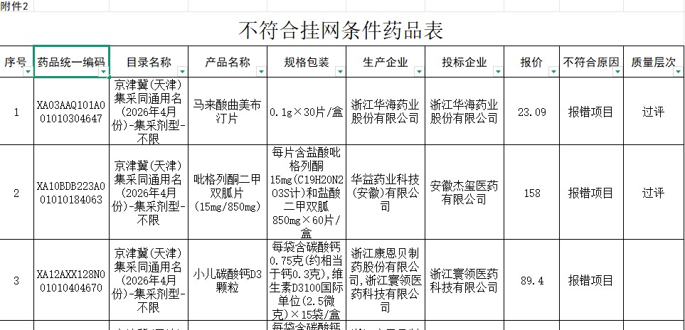 河北省集采同通用名药品不符合挂网条件药品表(20260428)