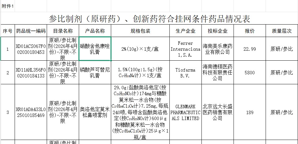 河北省参比制剂(原研药)、创新药符合挂网条件药品情况表(2026年4月份)