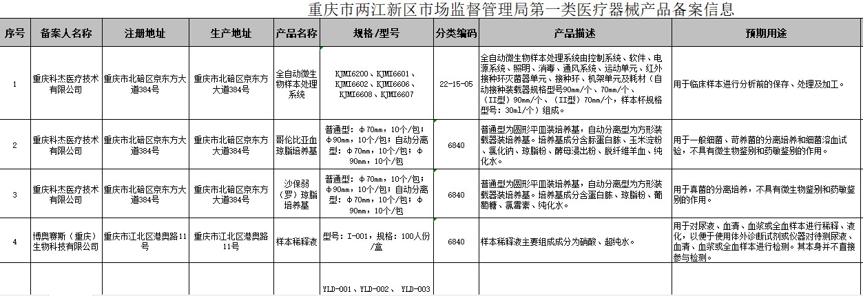 重庆市2026年4月1日至2026年4月20日两江新区市场监督管理局第一类医疗器械产品备案变更信息公示