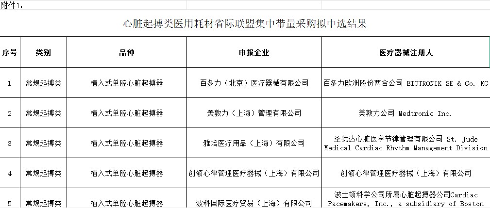 浙江省心脏起搏类医用耗材省际联盟集中带量采购拟中选结果(ZJHCCG-2026-01)