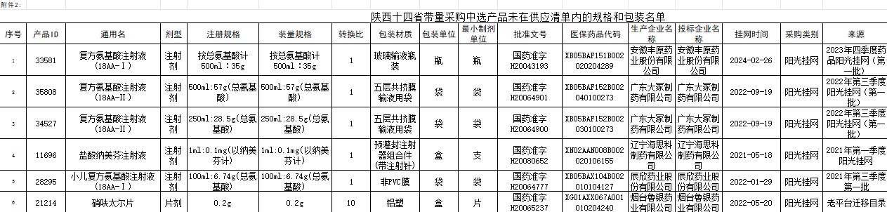 宁夏回族自治区陕西十四省带量采购中选产品未在供应清单内的规格和包装名单