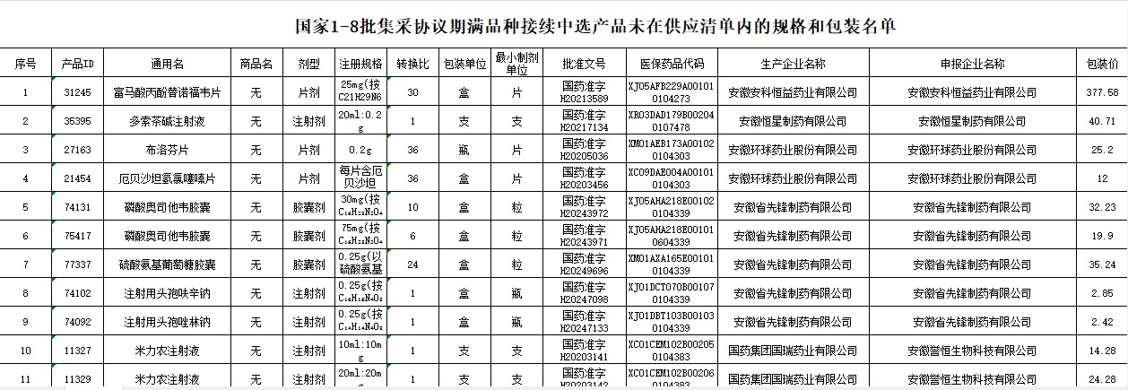 宁夏回族自治区国家1-8批集采协议期满品种接续中选产品未在供应清单内的规格和包装名单