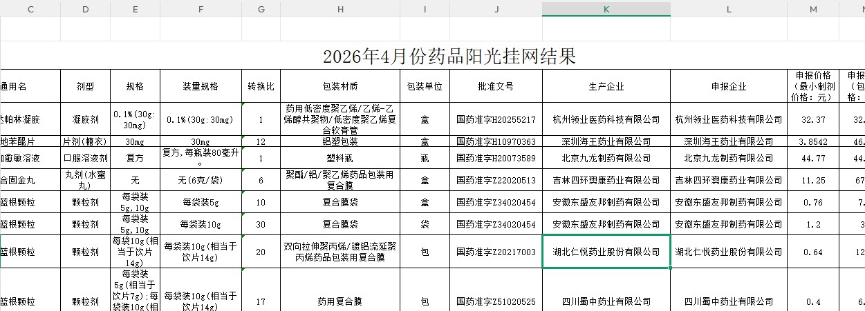 宁夏2026年4月份药品阳光挂网结果