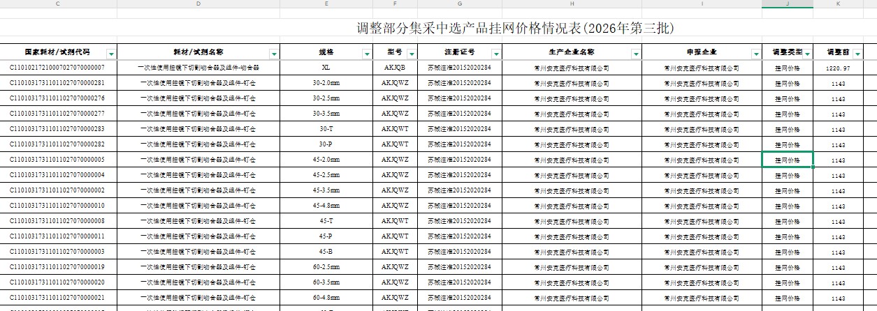 广西调整部分集采中选医用耗材挂网价格情况表(2026年第三批)