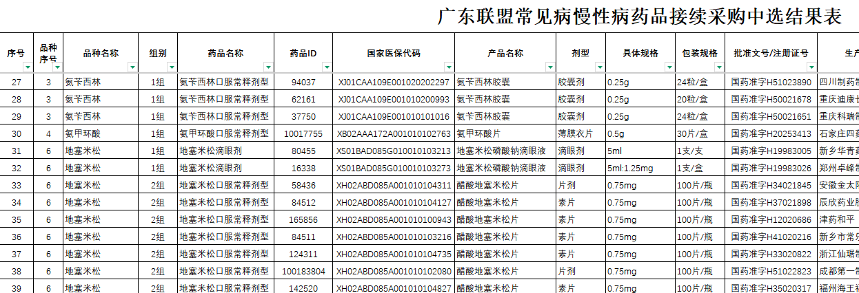 广东联盟常见病慢性病药品接续采购中选结果表附件