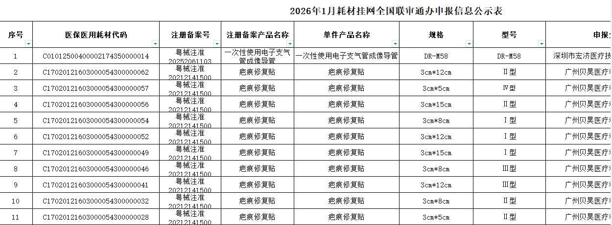 广西2026年1月医用耗材挂网全国联审通办申报信息公示表附件
