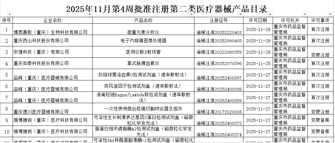 重庆市2025年11月第4周批准注册第二类医疗器械产品目录附件