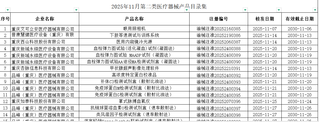 重庆市2025年11月第二类医疗器械产品目录集