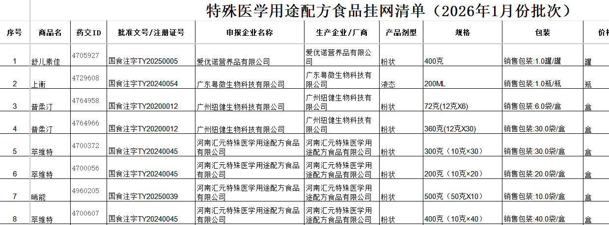 广东省特殊医学用途配方食品挂网清单(2026年1月份)