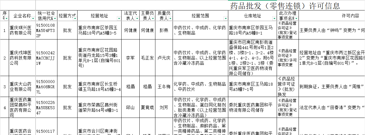 重庆市2026年1月第二周药品批发(零售连锁)许可信息