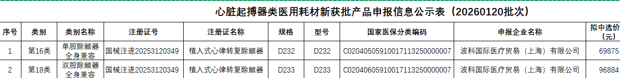 广东省心脏起搏器类医用耗材新获批产品申报信息公示表(20260120批次)附件