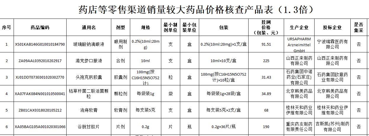 吉林省与药店等零售渠道销量较大药品价格核查1.3倍产品公示表附件