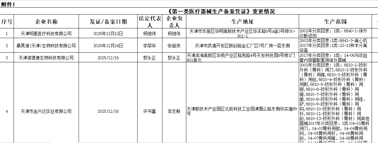 天津市第一类医疗器械生产备案公示(2025第12期)