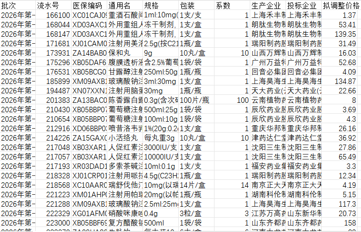 辽宁省确认价格调整名单260128