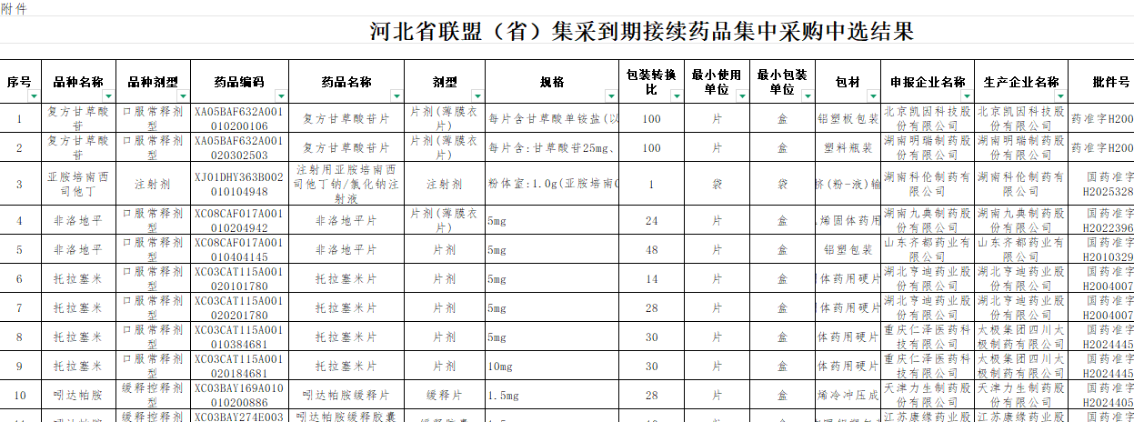 河北省联盟(省)集采到期接续药品集中采购中选结果260129附件