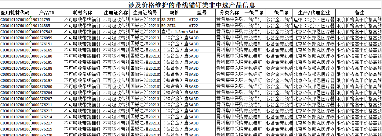 浙江省涉及价格维护的带线锚钉类非中选产品信息